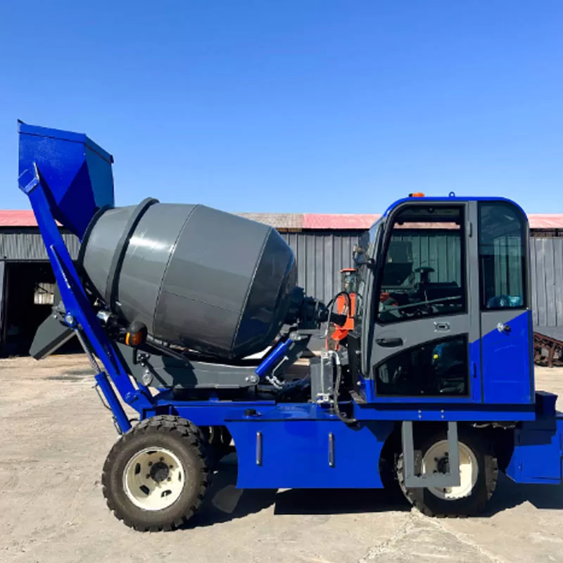 High-efficiency concrete mixing equipment, self-loading concrete mixer = mixer + loader + truck. Main hydraulic components are imported. Saves at least 5 laborers per day. No need for electric concrete mixers, saving up to 100 kWh of electricity per day. No longer need a separate concrete mixer truck. No longer need a wheel loader to load materials.