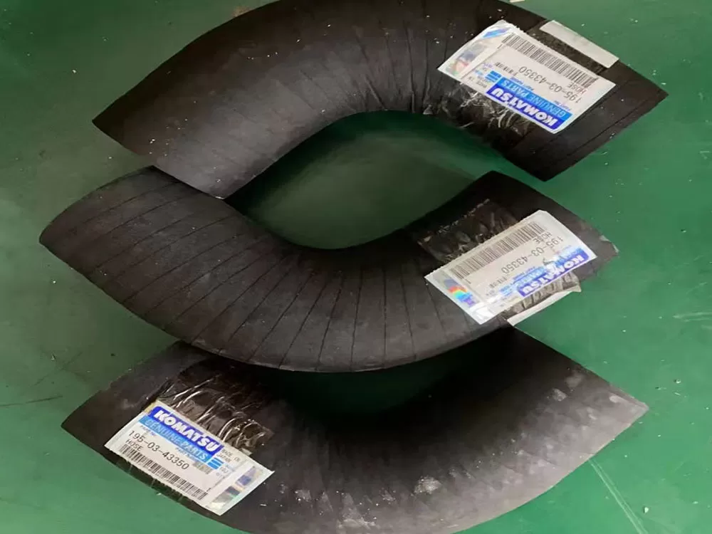 The coolant hoses connect the radiator to the engine and deliver coolant. The water tank hoses (part number 115R-03-00006) on the Shantui DH24 bulldozer are original factory parts.