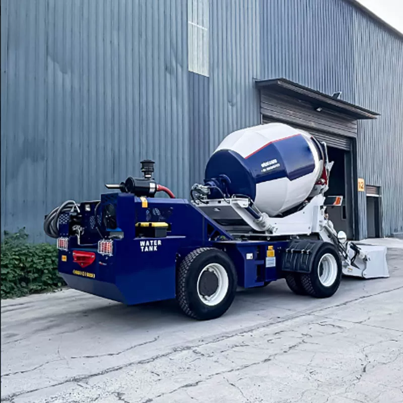 High-efficiency concrete mixing equipment, self-loading concrete mixer = mixer + loader + truck. The main hydraulic components are imported. Saves at least 5 laborers per day. No need for an electric concrete mixer, saving up to 100 kWh of electricity per day. No longer requires a separate concrete mixer truck. No longer requires a wheel loader to load materials.