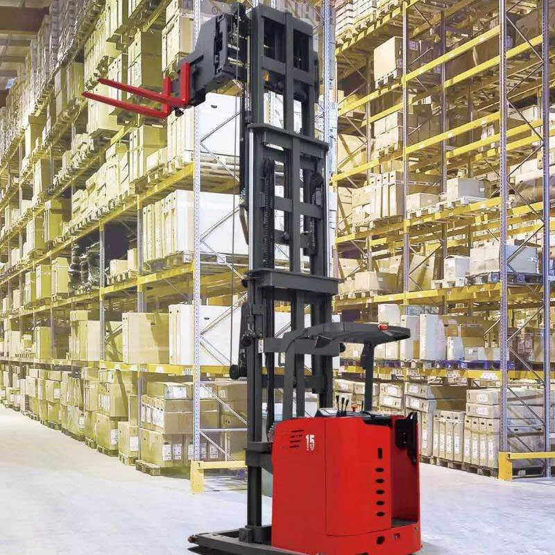 Three-way stacking, no load loss, less than 5500 mm, the preferred solution for dense storage, minimum aisle width 1480 mm. Three-way stacking function: the forks can rotate 180 degrees, enabling lateral movement without body rotation. It is the best choice for expanding warehouse space for dense storage. The minimum working aisle width is only 1480 mm (MC10 series, 1000*1000 mm pallet size), saving space and increasing storage capacity.