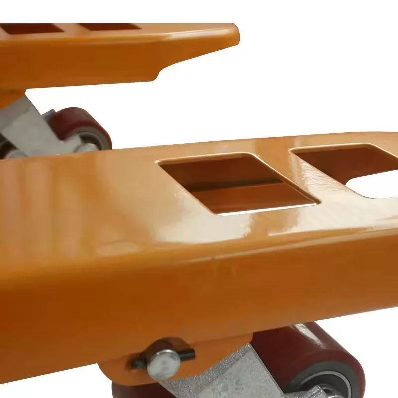 Horquillas anchas para palés de fácil manejo y compatibilidad con palés de diversos tamaños. Ruedas de alta calidad con cojinetes silenciosos y poleas de nailon que mejoran la suavidad y la resistencia al desgaste sin dañar el suelo. Su pequeño radio de giro y su estrecho ancho de pasillo la hacen adecuada para diversas superficies viales complejas.